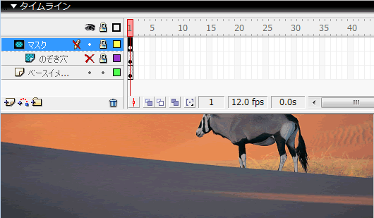 ②のぞき穴レイヤーのフレーム1に線なし、塗りを黒にして四角を書いて(描く場所は、ステージのどこでもよい。)、
