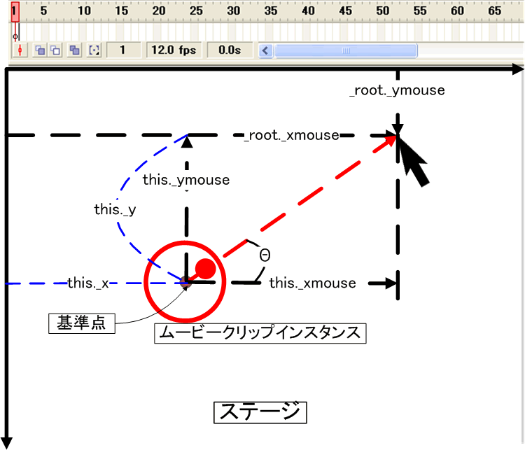 したがって、キャラクタが置かれているタイムラインの位置(_parent._ymouse, _parent._xmouse)からキャラクタがステージに置かれている