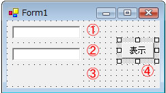 オブジェクト名:①TextBox1 ②TextBox2 ③Label1 ④Button1
