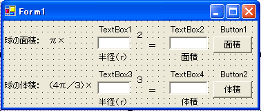 変数(r)と定数(pi)を宣言し、球の面積と体積を求める。