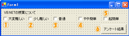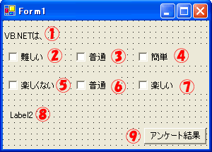 ⑤以下のフォームを作成して、アンケート結果ボタン(Button1)をクリックすると以下のように、Label2に、